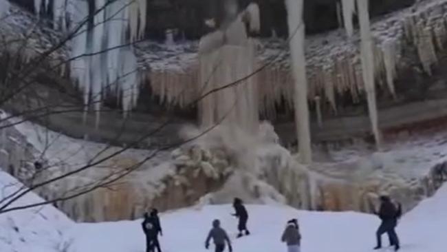 На видео можно увидеть, как люди убегают, когда лёд начинает падать, но одна женщина не успела отбежать вовремя: небольшая «лавина» в результате падения массы льда сбила её с ног, но в целом она не получила серьёзных травм.