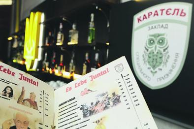 На стенах — камуфляж, политические карикатуры, вместо штор использована маскировочная сетка, внутри заведения — "стойка для рабов" с наручниками и ошейником, описывают "Вести" интерьер паба.