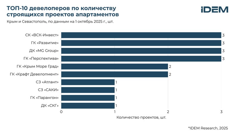 Как сообщили изданию в компании IDEM-консалтинг, по данным за октябрь 2025 года на территории Республики Крыма и города Севастополя строится 56 апарт-комплексов на 111 корпусов. Их общий номерной фонд превышает 22,5 тысячи апартаментов.