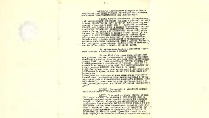 Как сообщили в ведомстве, широкой общественности стал доступен протокол допроса начальника 853-й немецкой комендатуры майора Георга Криммеля. Во время оккупации Крыма вместе с руководителем службы СД города Симферополя Паулем Цапом и другими сторонниками нацизма он отдавал приказы об убийстве невинных советских граждан.