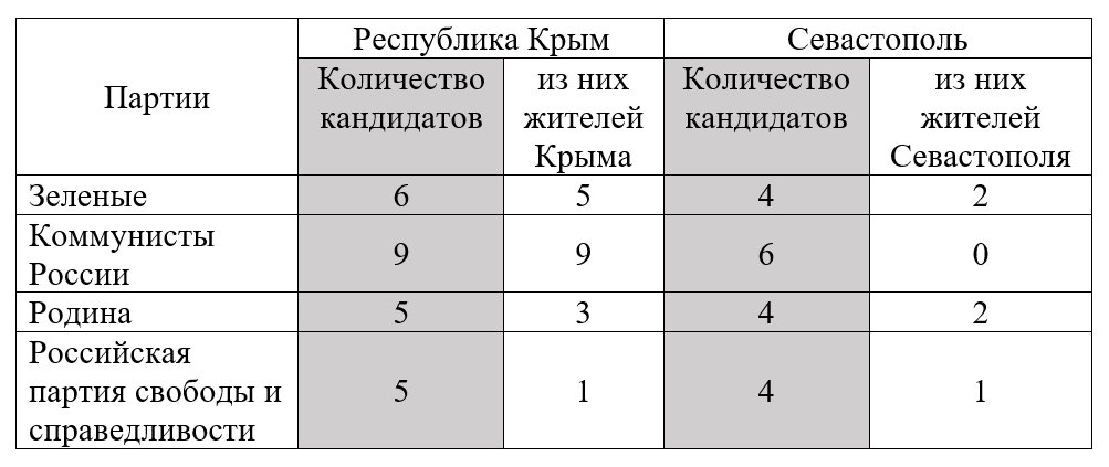 Отдельные региональные списки от Крыма и Севастополя зарегистрировали в ЦИК только четыре партии: «Зелёные», «Коммунисты России», «Российская партия свободы и справедливости» (РПСС) и «Родина»