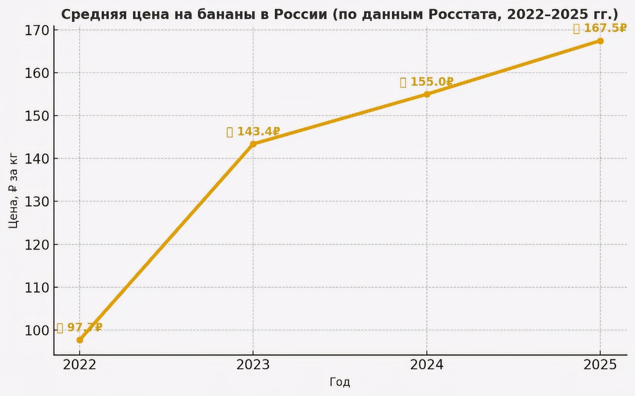 Отметим: за последние три года бананы сильно прибавили в цене: она выросла с 97,7 рублей за кг в октябре 2022 года до 167,5 рублей за кг в октябре 2025 года, то есть на 70%.