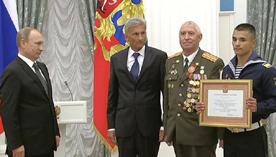 Президент России Владимир Путин в понедельник вручил грамоты о присвоении почетного звания "Город воинской славы" представителям Старой Руссы, Гатчины, Петрозаводска, Грозного и Феодосии. Церемония, приуроченная ко Дню памяти и скорби, проходит в Кремле, передает телеканал "Россия 24".