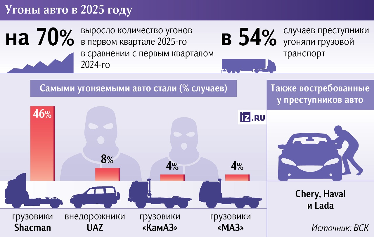 «В России всплеск угонов авто: за первые три месяца 2025-го их количество выросло на 70% по сравнению с аналогичным периодом предыдущего года. Больше всего таких преступлений было в феврале. Наиболее угоняемым видом транспорта стали грузовики — на них пришлось 54% случаев», — привели свои данные в Страховом доме ВСК.