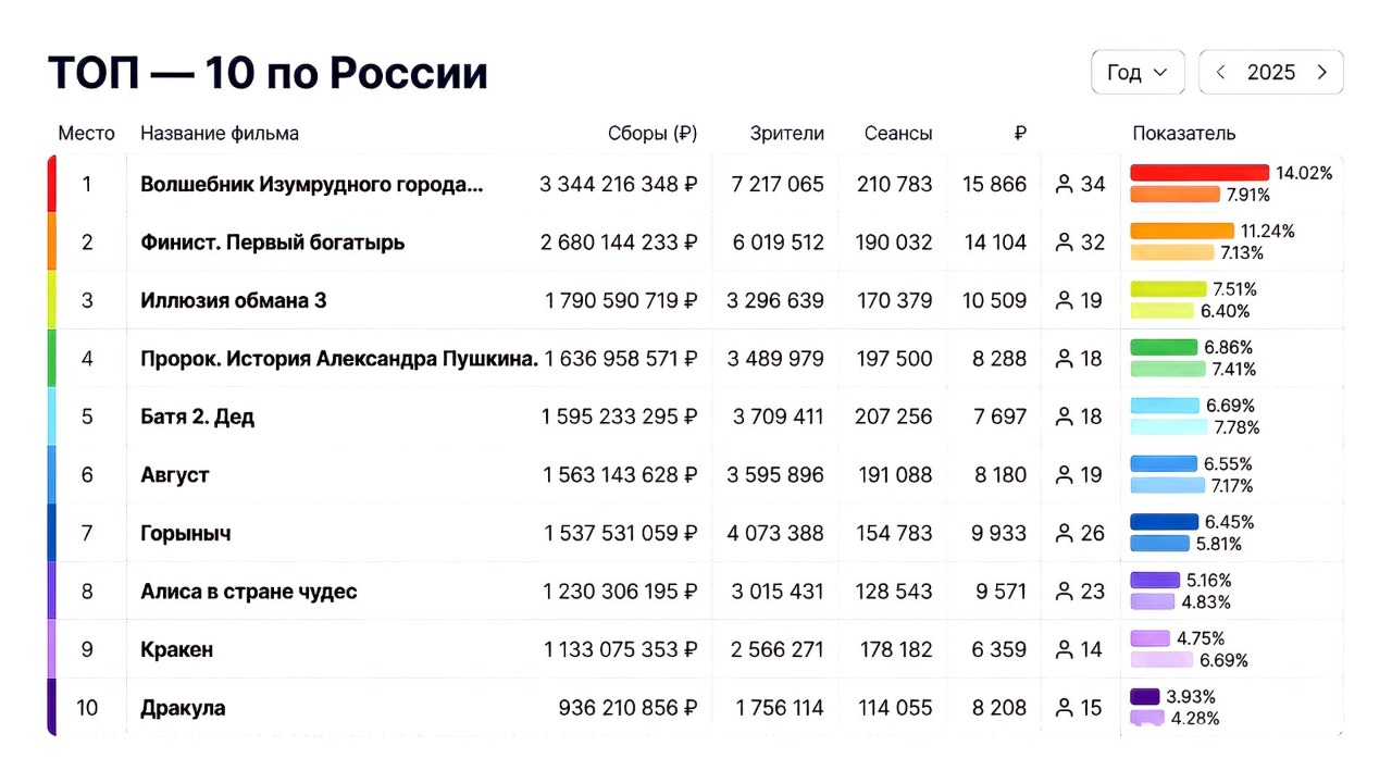 Тем не менее, российское кино сейчас на подъёме: в 2025 году лидером проката стало фэнтези Игоря Волошина «Волшебник Изумрудного города. Дорога из жёлтого кирпича». Картина заработала 3,3 млрд рублей — это лучший финансовый показатель в прошлом году.