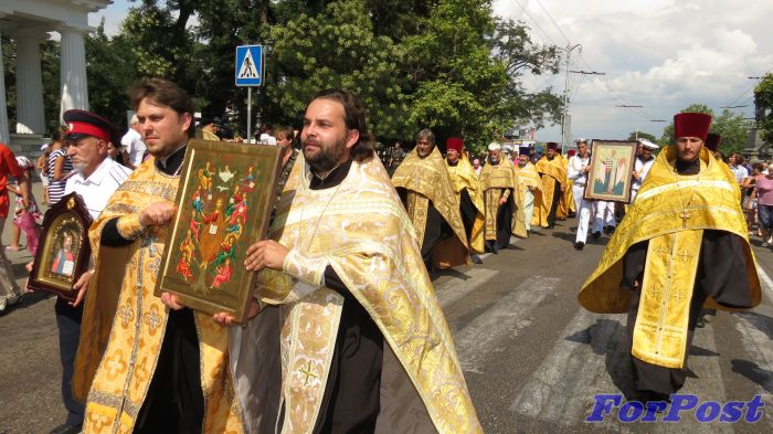 От Графской пристани православные христиане и военные моряки отправились в Херсонес. По пути к колонне верующих присоединился ещё один крестный ход, идущий от храма Державной иконы Божией Матери на Красной горке.