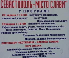 Фестиваль «Севастополь – город славы» был организован Минкультом Украины, «Просвитой» и ассоциацией «Козацтво». В рамках его на эстраде Приморского бульвара выступили коллективы из Ровно, Киева, Полтавы, Кировограда и т.п.