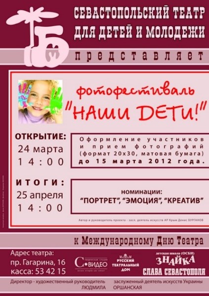 К Международному Дню театра Севастопольский театр для детей и молодежи ТБМ совместно с газетой «Слава Севастополя» и творческой студией «С-Видео», проводят фотофестиваль «Наши дети!».