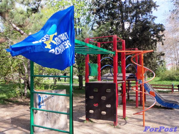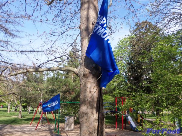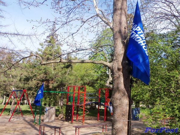Жители улицы Ефремова утром наблюдали из своих окон необычное зрелище – сквер Курсантов в течение нескольких минут превратился как минимум в арену партийного съезда - если исходить из количества сине-белых флагов, щедро развешенных на столбах и деревьях сквера. Наглядная агитация Партии регионов развевалась даже на детской площадке. Однако оказалось, что с такой помпой всего-то проводится - «день чистоты»!