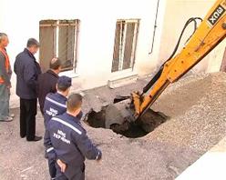 Четырехтонная машина чуть не провалилась трехметровую яму. Водитель тяжеловеса быстро среагировал и отъехал от места происшествия. Огромное углубление в земле образовалось вблизи жилого дома.