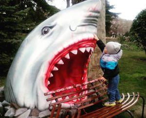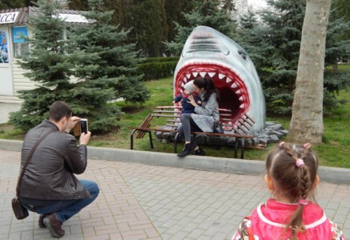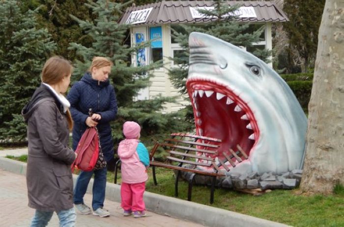 В начале марта Севастопольский аквариум, расположенный на территории Приморского бульвара, после реставрации открыл для посетителей три зала. Чтобы привлечь клиентов, заведение установило на одной из аллей бульвара скамейку, а сзади неё – пасть акулы, похожая на те скульптуры, что обычно находятся в парках развлечений.