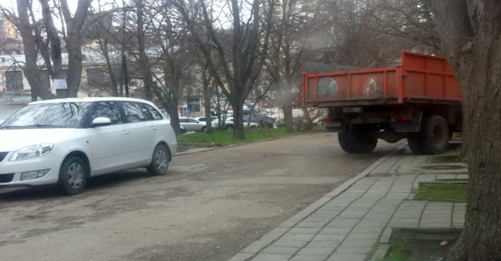 Обратите внимание на газоны и тротуары напротив магазина "Приветливый" и кинотеатра "Москва". Множество машин! Не только уборочные или доставляющие продукты в многочисленные магазинчики, но и частные автомобили в огромном количестве! Асфальт давно разбит, люди обходят машины по газонам (от которых тоже мало что осталось). Автомобилисты даже не понимают, что едут по тротуару. Здесь же на тротуарах и дорожках сквера оставляют машины на длительное время и вынуждают всех, в т.ч. мам с колясками, пожилых людей обходить их по грязи и лужам.