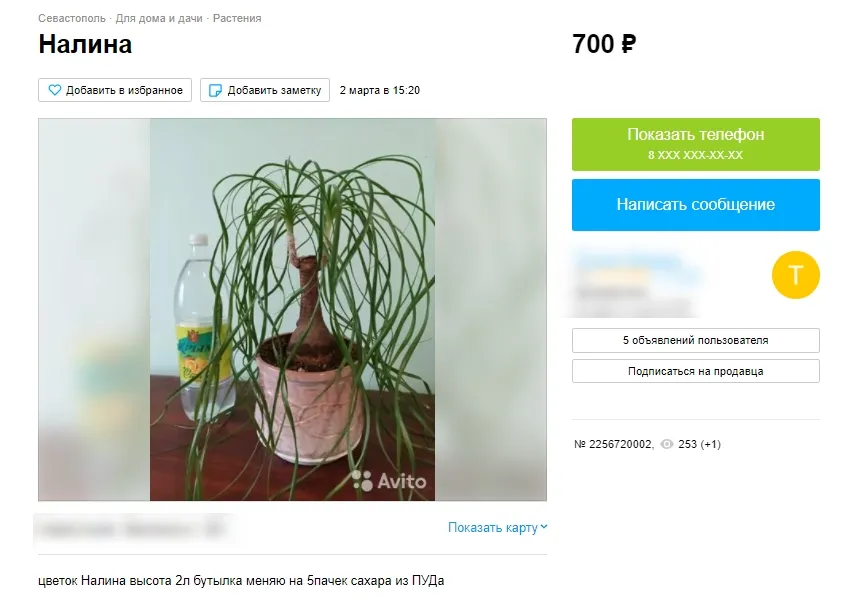 Ценовая конъюнктура, по-видимому, устоялась, поскольку курс 5 пачек сахара за одно растение встречается ещё в одном объявлении. Для повышения спроса на нолину в горшке рядом с ней поставлена передающая масштаб красоты растения двухлитровая пластиковая бутылка.