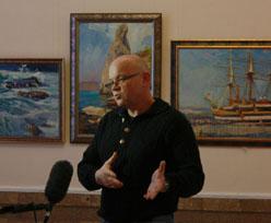 «На выставке представлено три грани моего творчества, три раздела. Первое посвящено исторически-батальной тематике, истории Севастополя, Альминскому сражению, Балаклавскому сражению, Великой Отечественной войне. Второй момент, здесь представленный, это мифологически-сказочный. Эти работы связаны с произведениями художественными, гомеровскими, историями мифов. Это более классические работы, мифологического плана. И третий - работы, связанные с пленэрной темой, то есть пейзажи. Эта тема представлена более широко, таких работ больше. В целом, могу сказать, хотя работы разные по темам, но тем не менее они выполнены с абсолютным чувством искренности и желанием донести зрителю ту правду - то ли в истории, то ли в пейзаже - которую я прочувствовал и видел. Я думаю, что выставка трехгранная, но она носит цельный характер», - рассказывает художник.