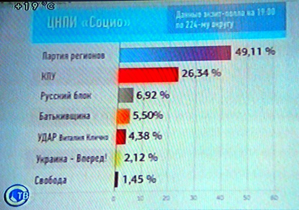 Результаты таковы. Партия регионов набирает 49,11% голосов, КПУ – 26,34%, Русский блок – 6,92%, Батькивщина – 5,50%
