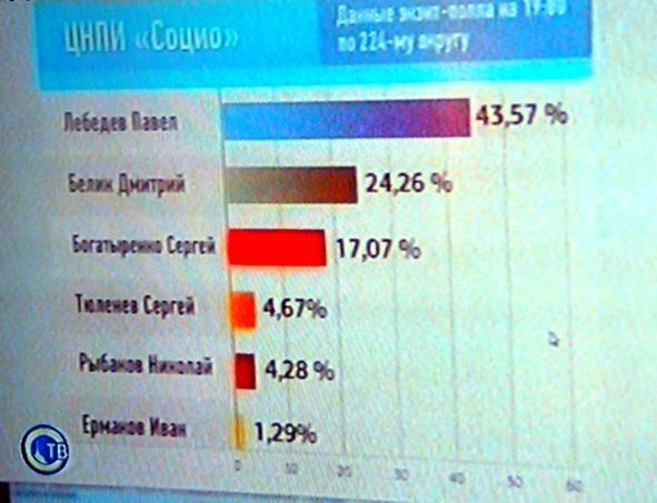 По мажоритарщикам результаты таковы: Павел Лебедев – 43,57%, Дмитрий Белик – 24,26%, Сергей Богатыренко – 17,07%