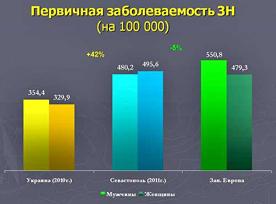 - На самом деле проблема в Украине с заболеваемостью злокачественными новообразованиями (ЗН) очень серьезна в связи с тем, что недовыявляются онкопатологии, - сказал Виктор Пологов. - В стране высокая смертность, но мало случаев выявления ЗН, значит, они просто не показываются. Нет никаких причин для того, чтобы мы отличались чем-то от Европы в плане населения по уровню заболеваемости злокачественными новообразованиями (см. иллюстрацию: центральный столбик - заболеваемость ЗН в Севастополе, слева - в Украине, справа - в Западной Европе. - Ред.).