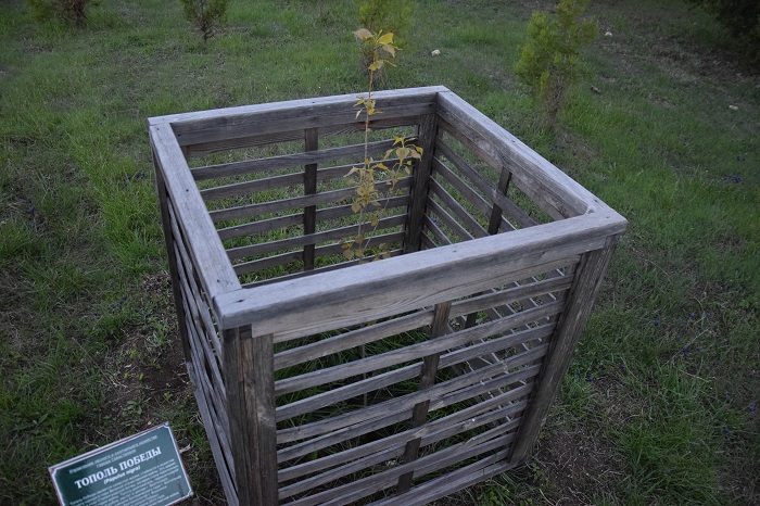 Этот черенок был выращен из почки столетнего чёрного тополя, который уцелел во время одного из решающих и самых ожесточённых сражений Великой Отечественной войны – Сталинградской битвы. В целях защиты ценного экспоната, вокруг него построили надёжный деревянный забор. Также у тополя установлена информационная табличка.