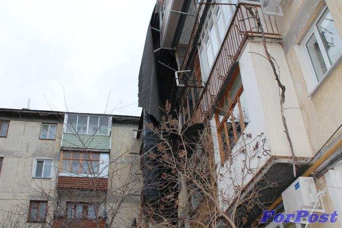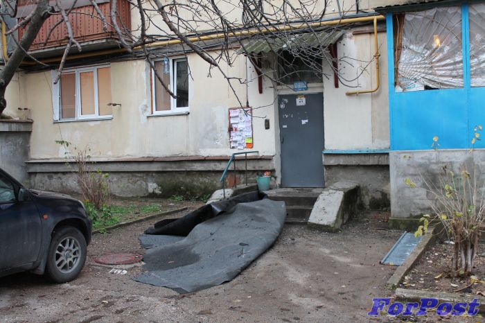 Оказалось, ночью в результате порыва ветра огромный лоскут мягкой кровли сорвало с крыши. Стоявшие внизу автомобили были покрыты слоем битума (у двух машин помяты крыши), на земле валялись части карнизов, бетонная крошка, а фрагмент кровли завис над крайним подъездом, подмяв под себя бельевые веревки и телевизионные антенны.