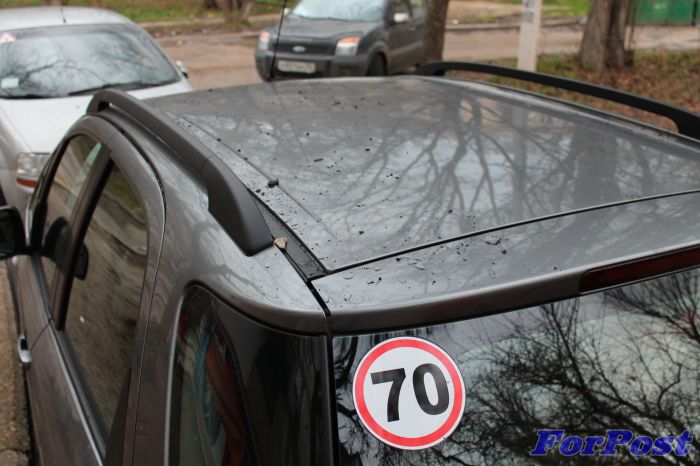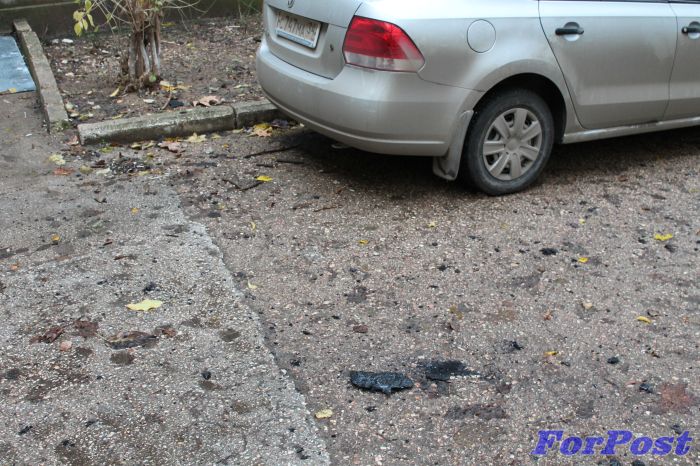 Стоявшие внизу автомобили были покрыты слоем битума (у двух машин помяты крыши)