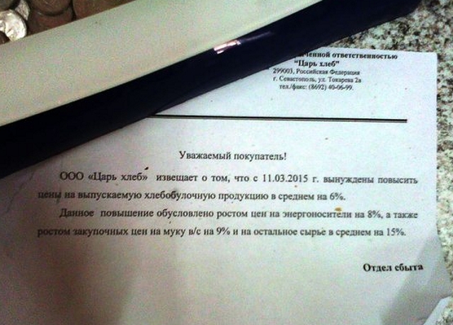 Со среды, 11 марта, в Севастополе снова подорожает хлеб. Цены вырастут в среднем на шесть процентов. Производитель — ООО «Царь-хлеб» — объясняет сложившуюся ситуацию восьмипроцентным ростом цен на энергоносители, а также тем, что закупочная цена муки выросла на девять процентов, а остальное сырьё — на пятнадцать.