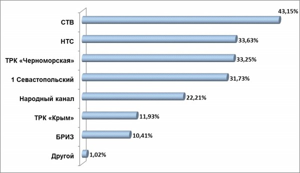 Наиболее авторитетным местным телеканалом стало СГРТРК, более известная под брендом СТВ (43%). НТС (33%), ТРК «Черноморская» (33%) и «1 Севастопольский» (31%) по рейтингу просмотров занимают примерно равные позиции. Рупор Севастопольского городского совета «Народный канал» смотрит 1/5 часть жителей г. Севастополя (22%). сдается мне что информация не объективная!