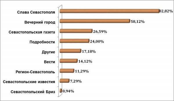 Среди печатных СМИ первое место по рейтингу прочтения занимает «Слава Севастополя». Оппозиционная газета «Подробности» занимает четвертое место с частотой прочтения 24%. Газета «Вести» (14%) недавно значительно увеличившая тираж на медиа-рынке Севастополя активно усиливает свои позиции.