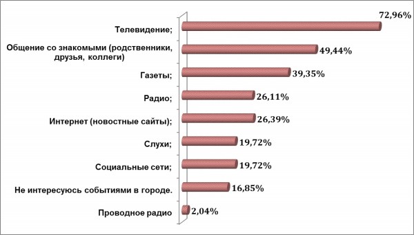 Анализируя источники получения информации, можно сделать вывод, что наиболее рейтинговым источником стало телевиденье (73%), второе место — общение со знакомыми (49%), третье — печатные СМИ (39%). Социальными сетями пользуются каждый пятый житель Севастополя (20%).