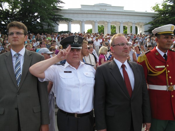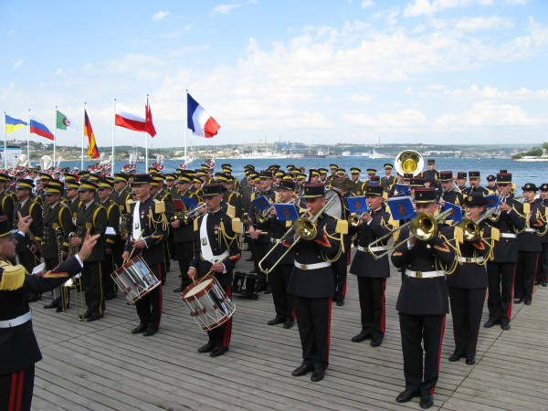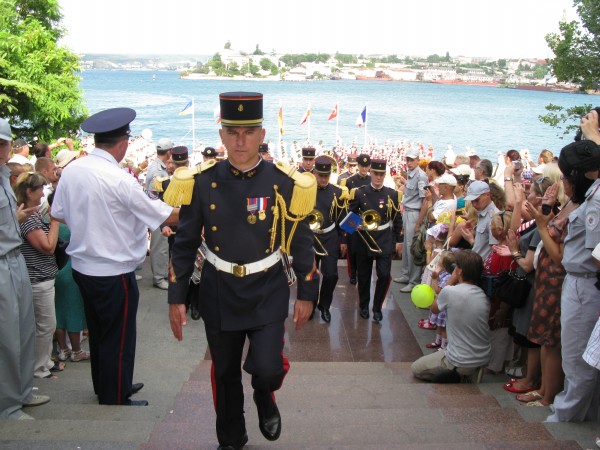 Следом «слово берет» оркестр 810-й отдельной бригады морской пехоты Черноморского флота (бригадой командует Герой России полковник Владимир Белявский). Именно этот оркестр представляет Российскую Федерацию, поскольку оркестр ЧФ под управлением капитана 3 ранга Александра Свириденко только сегодня вернулся в Севастополь на БДК «Цезарь Куников» из итальянской Мессины. Звучит Государственный гимн России.