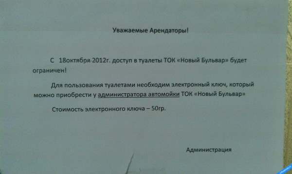 Теперь еще и посещение туалета в данном комплексе обойдется в 50 грн. Об этом гласит табличка на обоих этажах строения.