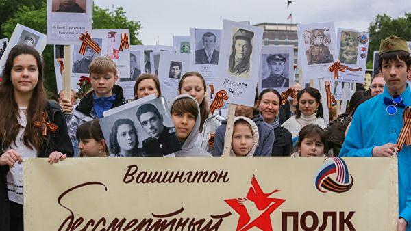По сложившейся традиции люди собрались у Белого дома, откуда затем прошли маршем до мемориала Второй мировой войны с фотографиями своих родных. Многие были одеты в футболки и куртки с символикой "Бессмертного полка", а некоторые дети – в военную форму времен войны.