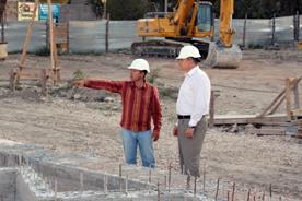 На сегодняшний день для того, чтобы ускорить процесс возведения, колоны выставляются прямо из машин. В течении двух недель балки будут выставлены, после чего можно будет заниматься крышей. Если все будет продолжаться в таком же ритмичном темпе и строители будут соответствовать ему, расширяя нормы рабочего дня, то через полтора-два месяца наши дети смогут заниматься. Задача очень серьезная.