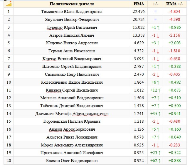 Из TOP – 20 рейтинга медиа активности выбыли спикер Верховной Рады Украины Владимир Литвин, вице-премьер-министр Сергей Тигипко, председатель совета "Объединенной оппозиции" Арсений Яценюк, а также бывший Президент Украины Леонид Кучма.