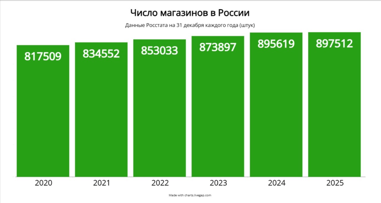 Число магазинов в РФ исключительно росло как минимум в 2020–2025 годах и достигло 897,5 тысячи.