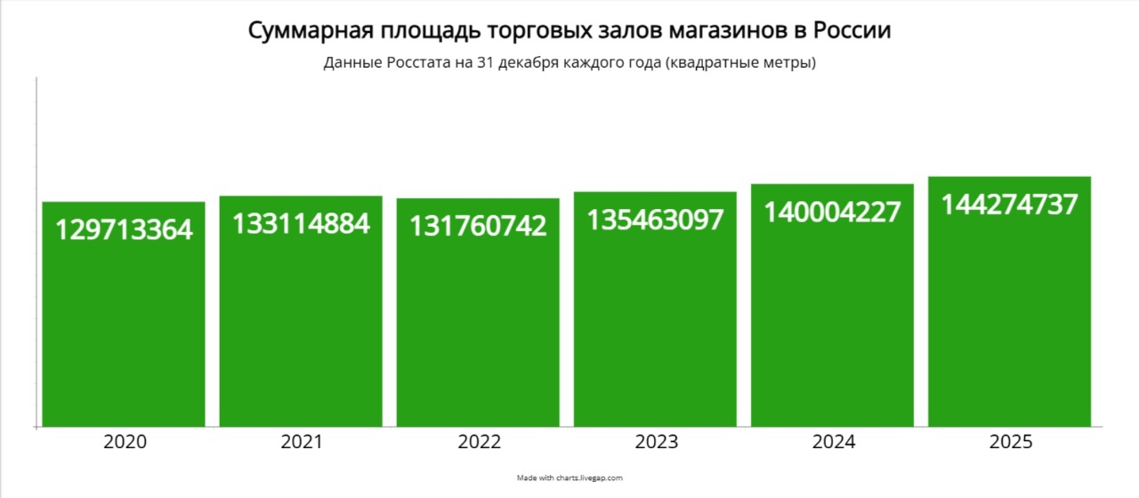 Суммарная площадь торговых залов магазинов также увеличивалась в это же время, кроме 2022 года. На конец 2025 года она составила 144,27 млн квадратных метров.