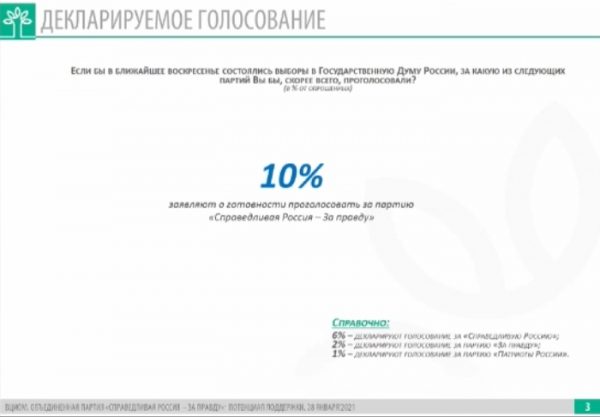 «Сегодня около 10% заявляют о том, что они готовы проголосовать за партию с названием «Справедливая Россия» — «За правду». Надо сказать, что за «СР» декларировали готовность проголосовать 6%, показатели «За правду» — 2%, «Патриотов России» — 1%», — сказал он.