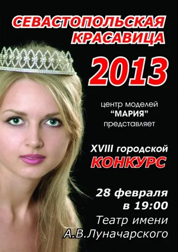 28 февраля в 19-00 на сцене академического театра имени А.В. Луначарского состоится 18-й городской конкурс «Севастопольская красавица-2013». Его организаторами выступают севастопольское агентство моделей «Мария» и Национальный комитет «Мисс Украина».