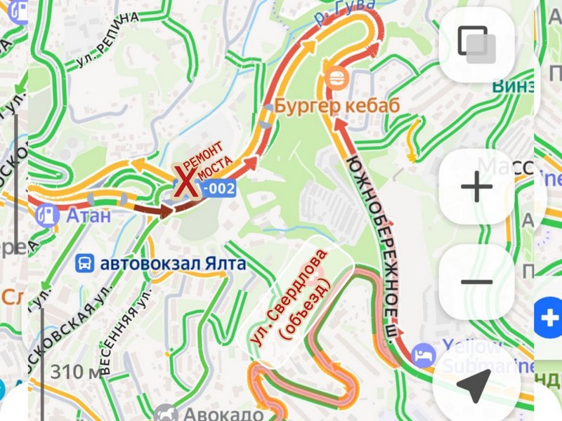 Между тем восточный въезд в Ялту по Южнобережному шоссе печально знаменит среди автомобилистов пробками в часы пик. Поэтому вероятно ожидать дополнительный рост заторов из-за вводимого здесь реверса. Объезд этого участка Минтранс предлагает через Массандру — по улице Свердлова.