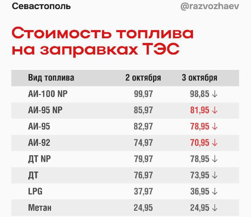 В своём телеграм-канале Михаил Развожаев опубликовал сравнительную таблицу цен на заправках ТЭС 2 октября и на 3 октября.