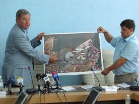 Он продемонстрировал карту территории мыса с границами существующих землеотводов и заявил, что на земле города, отведенной управлению капитального строительства СГГА (около 6 га) однозначно будет начато строительство исключительно мемориального комплекса, который будет состоять из музея, памятника и парка.