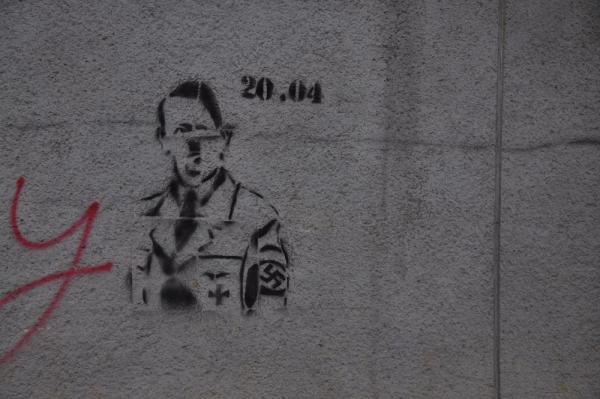 Гитлер нарисован черной краской с повязкой со свастикой на левой руке и немецким орлом на левом кармане. Рядом написано 20.04.