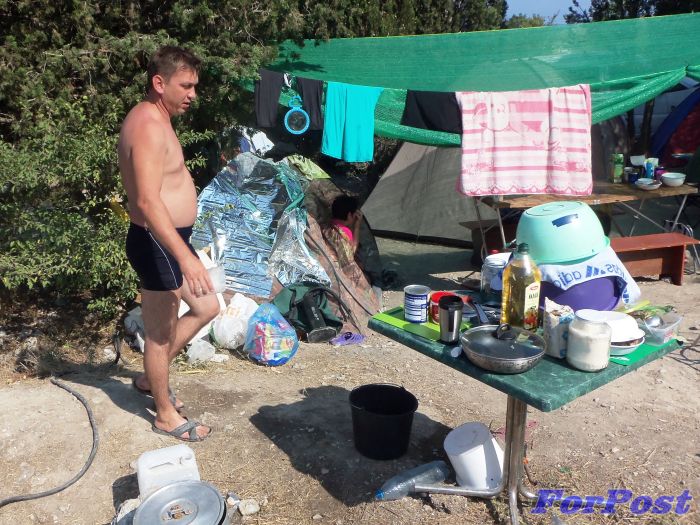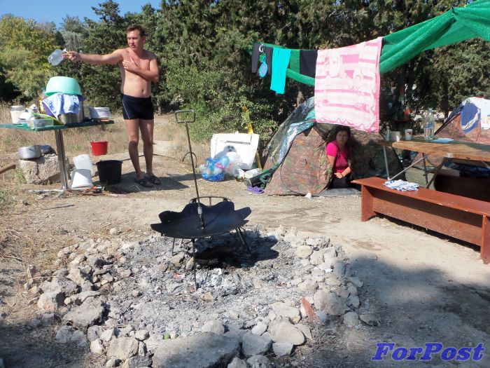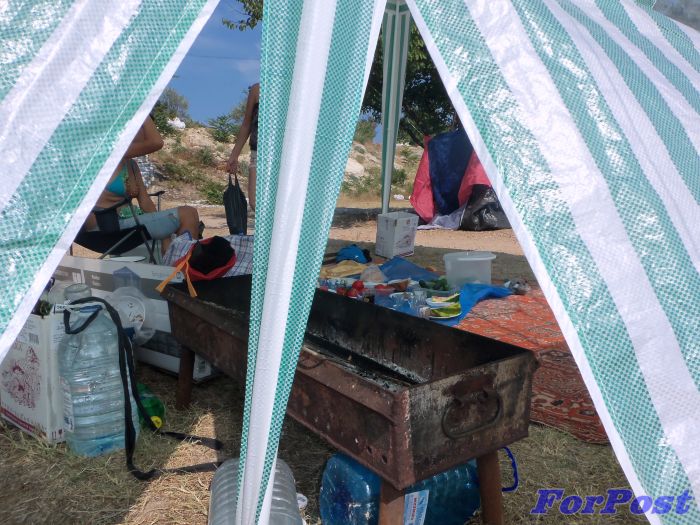 Но оказалось, что не все спешат на пляж «с утречкА». На «Солнечном» со вчерашнего вечера возле детской площадки расположился лагерь из 4-х палаток. Рядом - свежий пепел от ночного кострища, а также запас гофрокартона и дровишек из соседнего парка – для нового костерка. На нём доморощенные «туристы» готовят пищу. Об этом свидетельствует припрятанный в палатке металлический мангал.