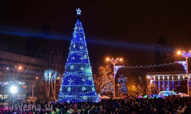 В этом году 23-метровую елку в Донецке украсили ожерельем с золотыми шарами в десять рядов. Игрушки подсветили трехкилометровой светодиодной гирляндой. Венчает елку сверкающая звезда.
