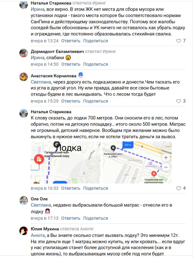 «К слову сказать, до лодки 700 метров. Они сносили его в лес, потом обратно, потом на детскую площадку… итого около 500 метров. Матрас не огромный, детский, наверное. В общем, при желании можно было выкинуть в нужное место, если не хотели тратить деньги за вывоз», — отвечает другой.
