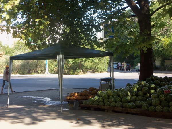 Основными потребителями бахчевых «с асфальта» каждое лето здесь становились отдыхающие, возвращающиеся с пляжей, и автомобилисты, стихийно останавливавшиеся прямо на троллейбусной остановке ради неожиданно подвернувшегося арбузика. Местным жителям от такой с позволения сказать «торговли», оставались кучи гниющих в мусорных баках нереализованных ягод и зловонная жижа, сочащаяся под великолепные гагаринские платаны. Продавцы с юга, привыкшие к реалиям торгово-кочевой жизни, умело обустраивали быт на перекрёстке. В ход шли «персидские» ковры с мусорки по соседству и взятая там же смердящая мебель. Спешащие по утру горожане, не удивляясь, пробегали мимо разбитой внутри торговой точки ночлежки продавцов, одновременно являющихся и круглосуточными охранниками своего товара. Такие «картинки с выставки» хорошо знакомы каждому спальному микрорайону. Успокаивала надежда на то, что с завершением сезона и отъездом отдыхающих «шалман» свернётся.