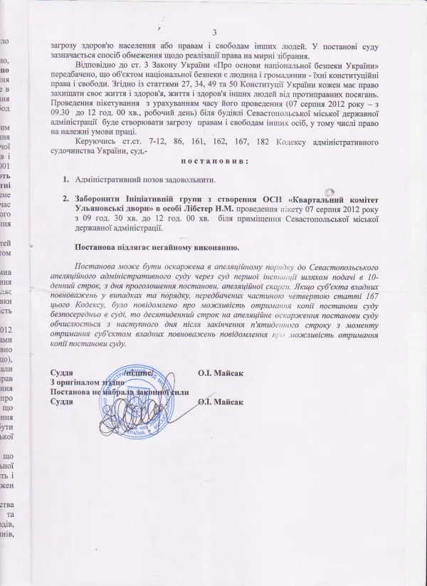 Пикет было решено провести перед зданием севастопольской городской государственной администрации, о чем было подано уведомление в Ленинскую РГА как того требует законодательство, И вот более 80 «ульяновцев» и поддерживающих их севастопольских общественников и депутатов пришли на Ленина 2, где за несколько минут до начала митинга к ним подошли представители исполнительной службы в сопровождении наряда милиции и сообщили, что решением административного суда г. Севастополя принято решение по иску Ленинской районной в городе Севастополе Администрации (председатель Виктор Сальников) о запрете проведения пикета против незаконной застройки.