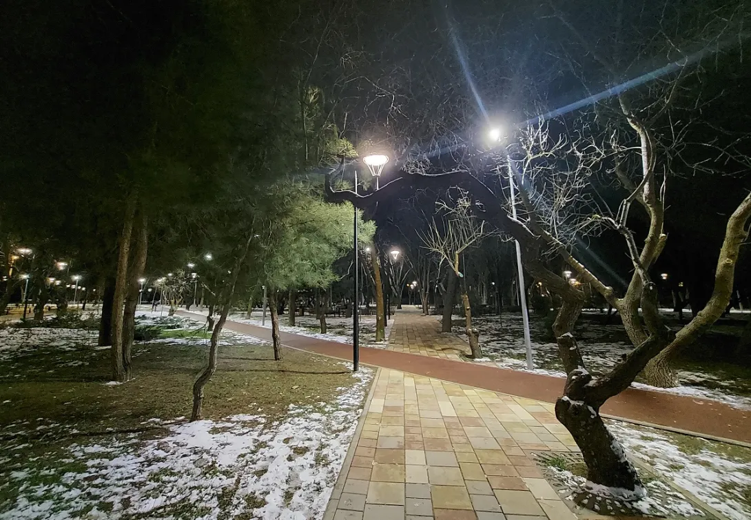 Безопасность парка, который даже зимой востребован горожанами с самого раннего утра и до самой глубокой ночи, — безусловно, самое важное. Правда, непонятно, какой смысл сочетать фонари двух типов, когда фонари в «шляпе» вполне справились бы с задачей, да ещё добавили бы скверу гармонии. Но это на взгляд профана. Возможно, на этот счёт есть свои нормы, или же проектировщик учитывал нюансы, недоступные широкой публике.