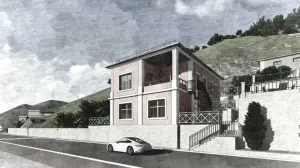 Речь идет о части того здания, которое севастопольцы неласково называют «голубым унитазом». Проект оформления входа в ресторан был разработан ИП Казанчи М.А. по заказу ООО «Управдом». Работа над этим фасадным решением велась в то же время, что и грандиозное строительство в «Новом Херсонесе». И, возможно, это как-то повлияло на разработчиков: несмотря на сугубо современный облик здания, им тоже захотелось чего-то античного.