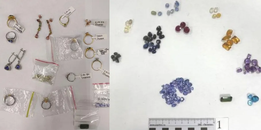 Однако у иностранца подобные товары как раз обнаружились. В карманах его брюк находились кольца, серьги и разноцветные камни, расфасованные по небольшим zip-пакетам. Дальнейшая экспертиза показала, что мужчина перевозил украшения из золота разных проб, от 375-й до 750-й, а также драгоценные и полудрагоценные камни, среди которых были бриллианты, танзаниты, турмалины, топазы, кварцы, адуляры, бериллы и гранаты.