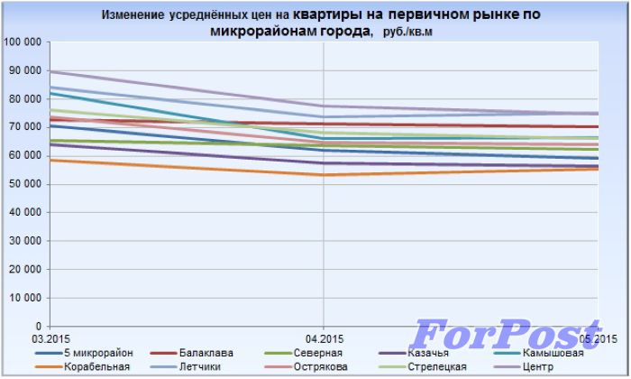 В текущем месяце средняя стоимость жилой недвижимости на первичном рынке по рассматриваемым районам на рынке г. Севастополя составила 64 965 руб./кв.м.